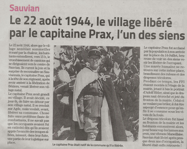 Sauvian était libéré ! Et la gratitude des habitants envers leurs libérateurs, incarnés par le capitaine Prax, un Sauviannais, et qui fut si grande ce 22 août 1944, ne doit jamais être oubliée…