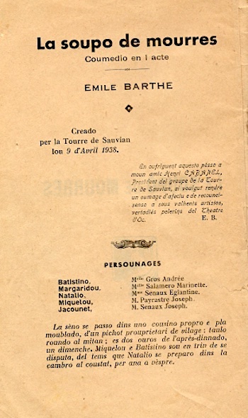 Et sous les yeux d’un public sous le charme, le boucher, le maréchal-ferrant, la voisine faisaient pleurer quand ils interprétaient « Lous viels » (Les vieux), ou rire aux éclats en jouant la pièce écrite par Henri Cabanel avec son grand ami Émile Barthe, « La soupo de mourres » (La soupe à la grimace). En outre, il y avait dans la troupe deux jeunes femmes, chanteuses, dont l’une surnommée le Rossignol, qui interprétaient les airs à la mode. Chaque représentation se terminait toujours par une quête au chapeau. L’argent ainsi récolté servait à payer costumes et décors, mais aussi les frais de déplacement de la troupe…